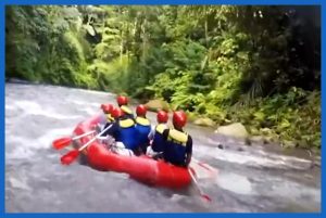 Kegiatan mengarungi derasnya arus sungai yang sangat menantang di sungai Ayung di Ubud